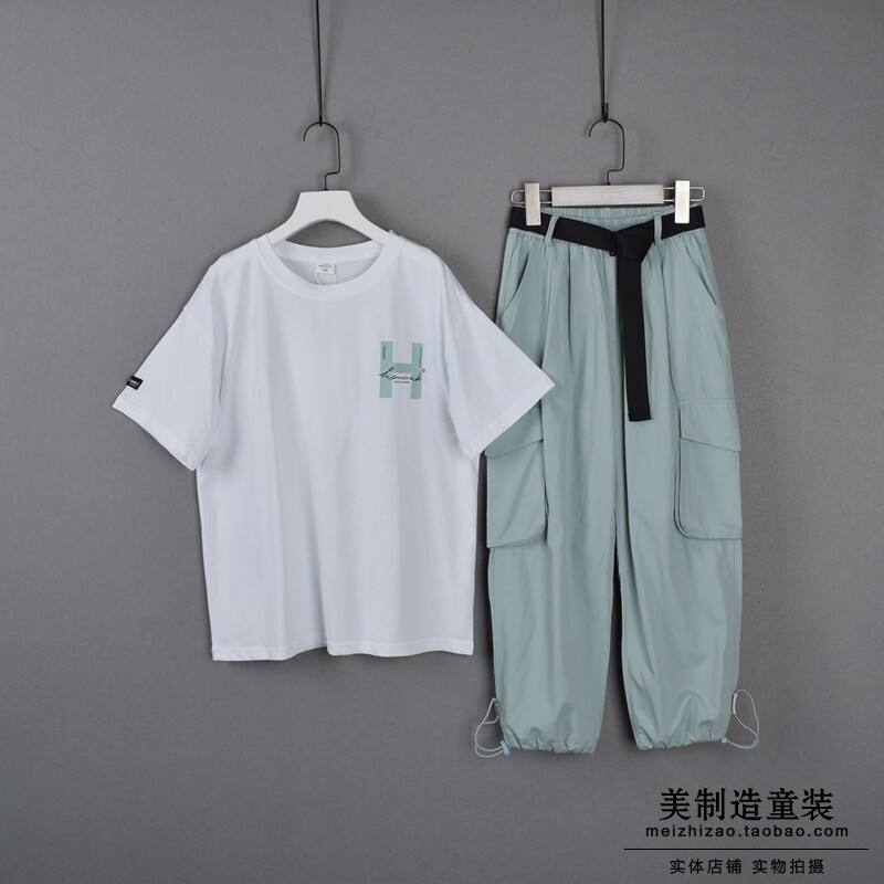 艾米可多中大童女童夏装宽松短袖T恤棉布八分裤工装裤中裤两件套热门设计联盟服务商